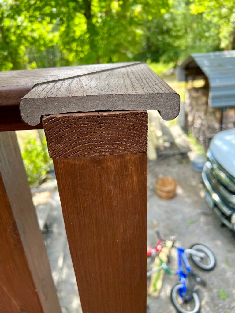 While Trex boards don’t need staining, we did stain the pressure-treated posts and beams to protect the wood and help everything blend together visually.