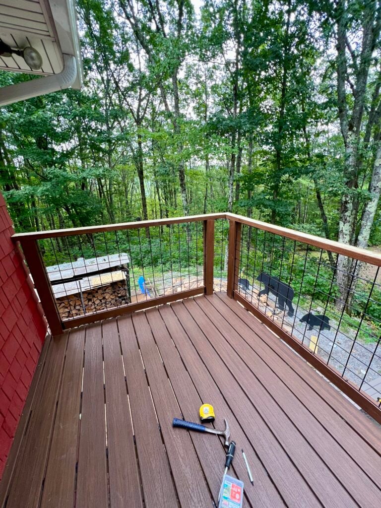 This deck has quickly become one of our favorite parts of the house. It blends into the woods, feels solid underfoot, and requires almost no upkeep — exactly what we hoped for.
