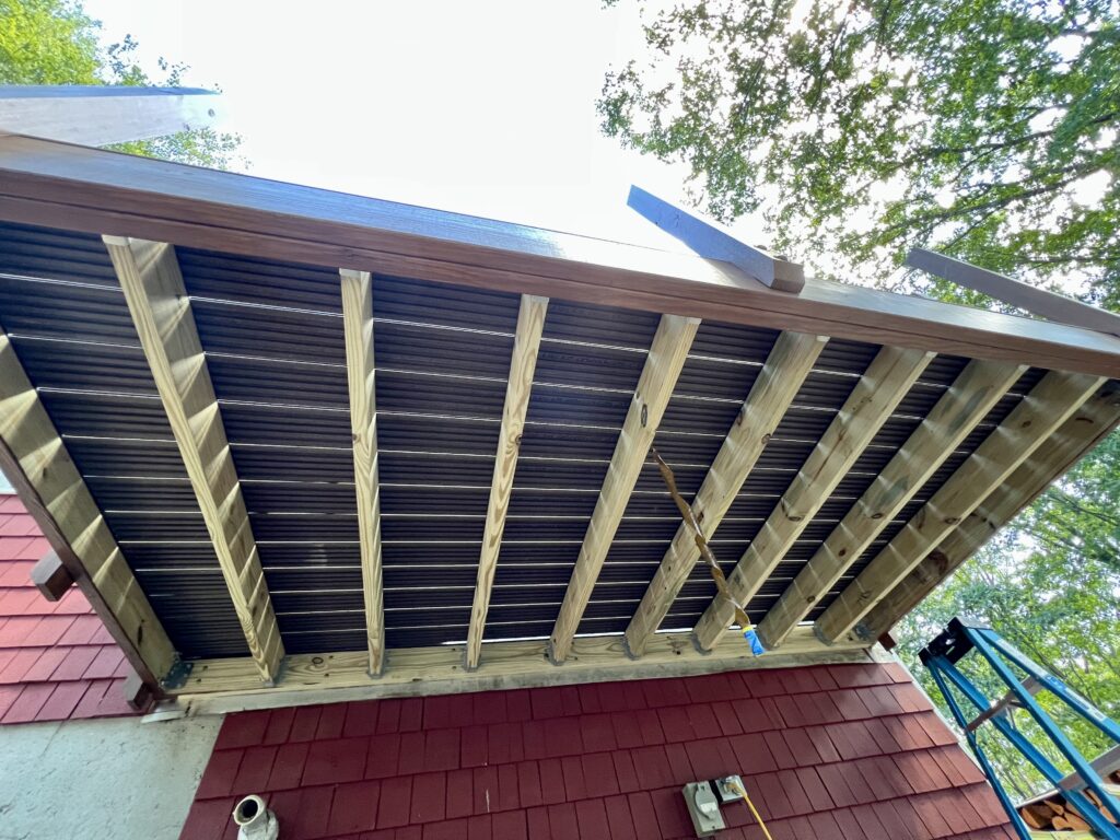 Once the beams were in place, deck joists were installed and spaced evenly. We added deck joist tape to the tops of the joists — a small step that goes a long way in protecting the framing from moisture and extending the life of the deck.