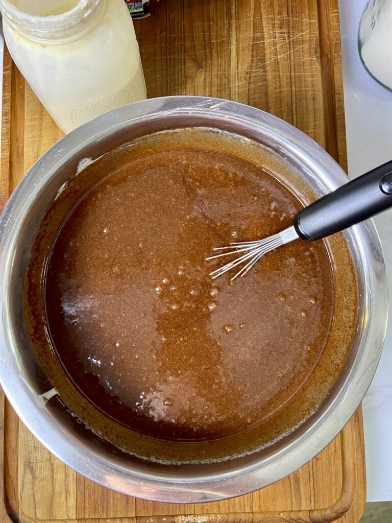 - Mix Wet Ingredients – In a large bowl, whisk together the granulated sugar, brown sugar, eggs, vanilla extract, and sourdough starter. Stir in the melted chocolate mixture.