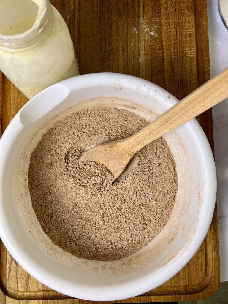 In a large bowl, whisk together the granulated sugar, brown sugar, eggs, vanilla extract, and sourdough starter. Stir in the melted chocolate mixture.