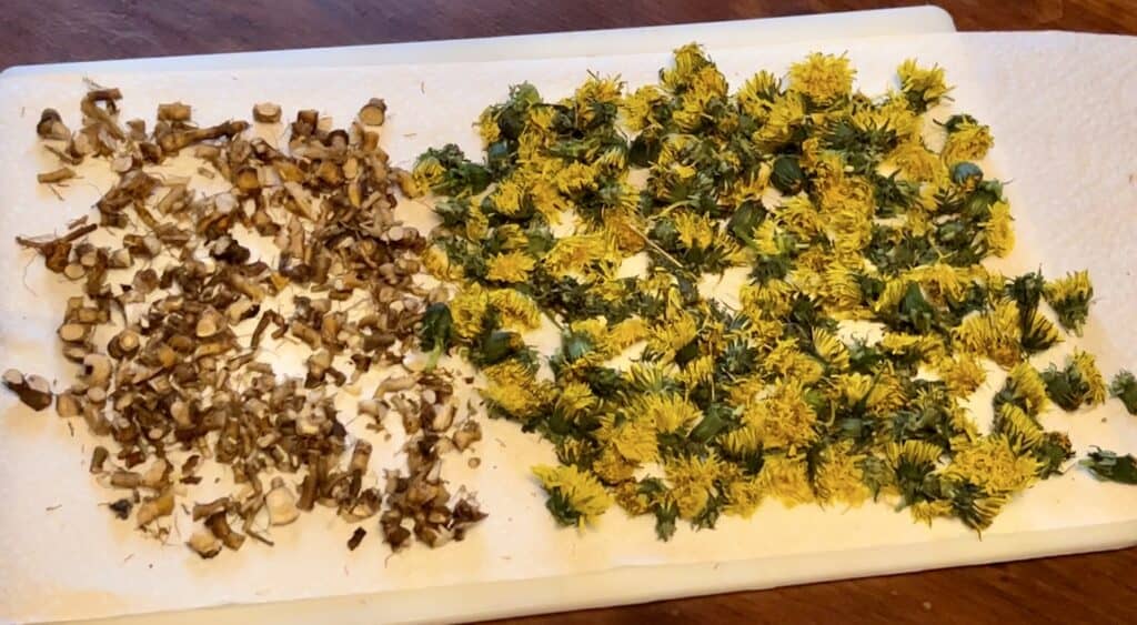 First, carefully dig up dandelion roots. Make sure not to take the whole plant, so it can grow back. Clean the roots well to get rid of any dirt. Cut them into slices and dry them out. You can use a dehydrator or just an oven. Once they’re dry and fragile, roast them at 350°F (175°C). Cook them for 15 to 20 minutes, until they smell good and turn golden-brown.