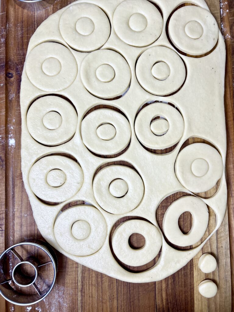 Turn the dough out onto a lightly floured surface and roll to about ½-inch thickness. Cut donuts using a donut cutter or two round cutters.