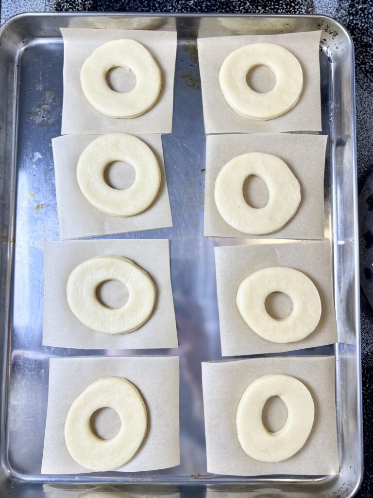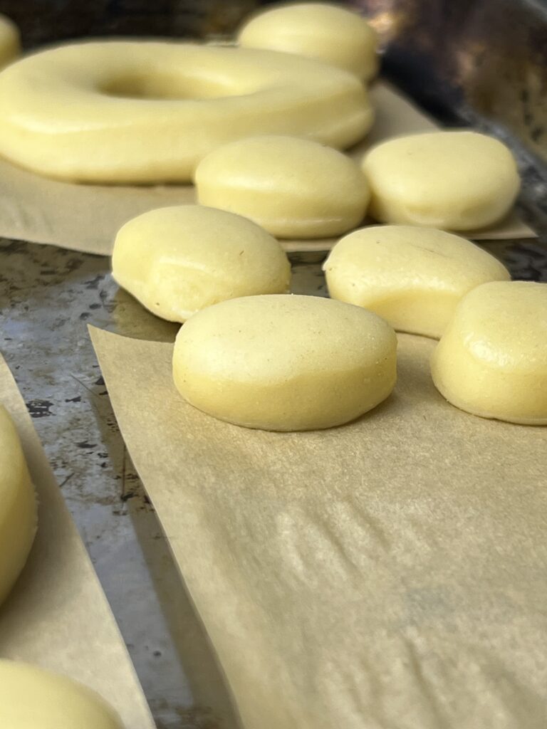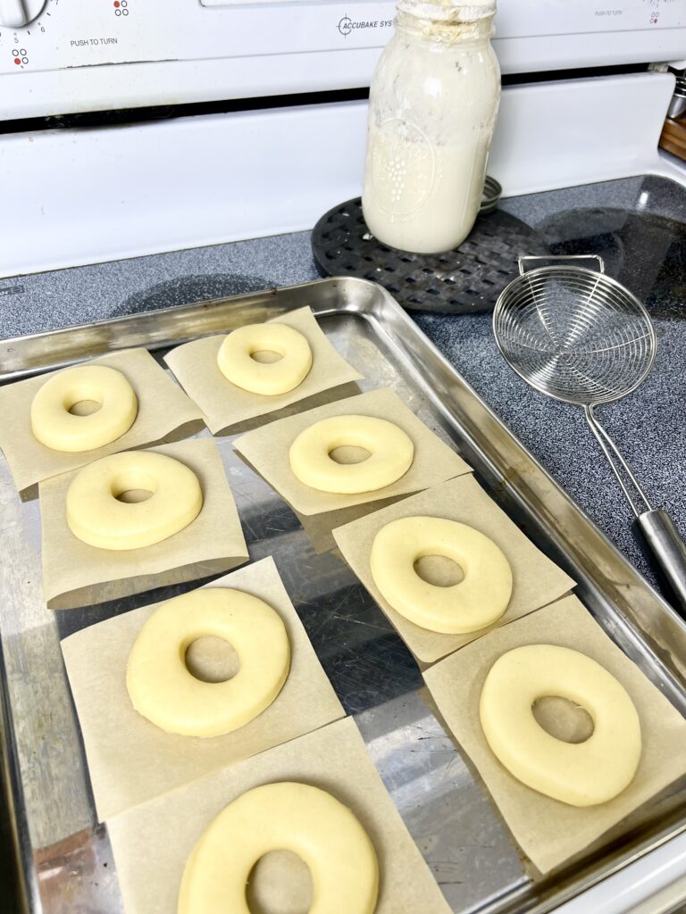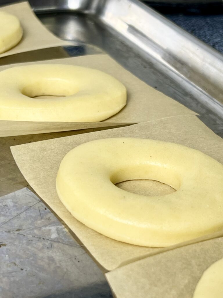 - Place donuts on parchment-lined baking sheets, cover lightly, and rest for 30–60 minutes until slightly puffy.