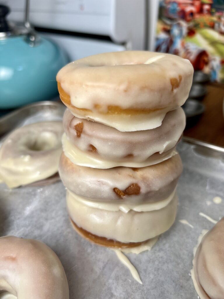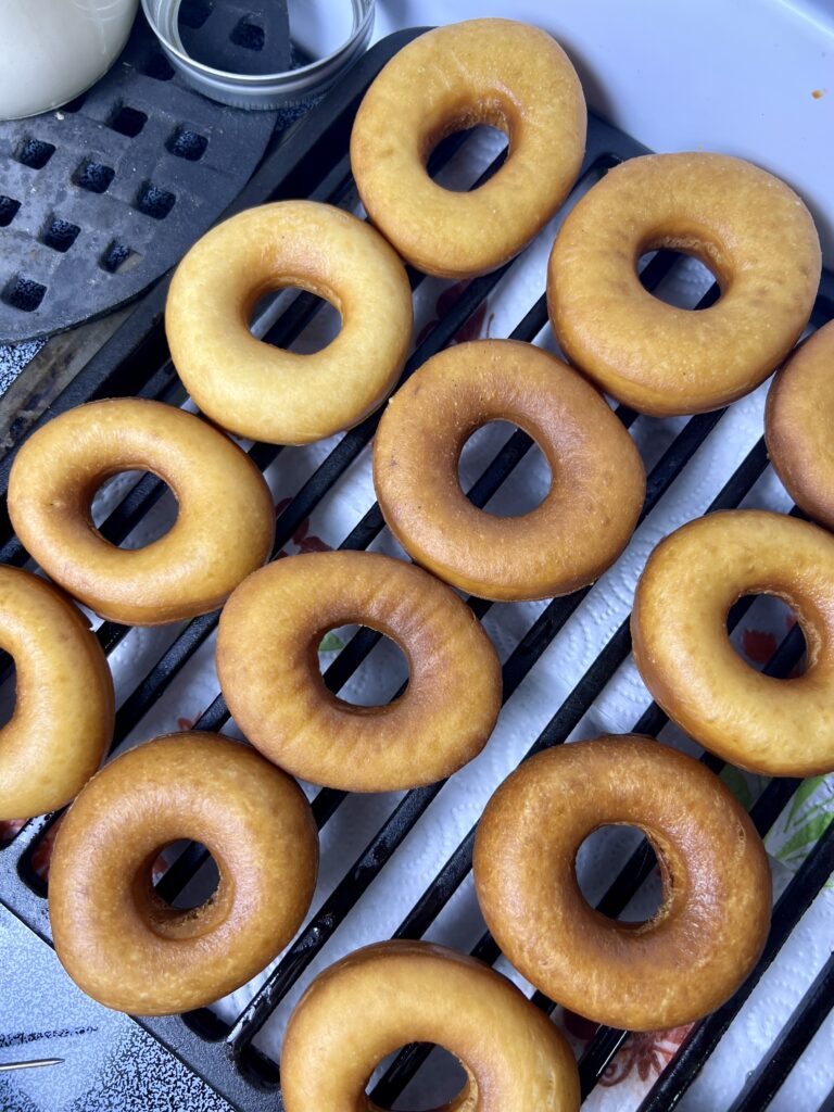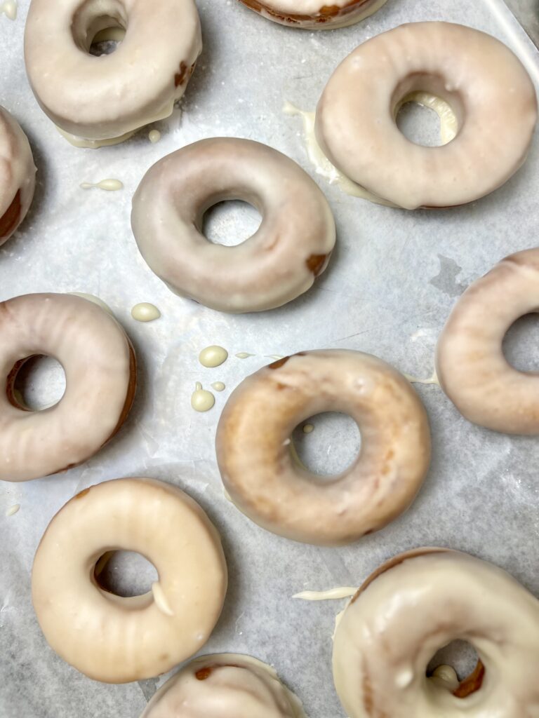 - dip each donut in the Glaze, flipping to cover both sides. Place on a wax or parchment paper lined baking tray to cool.
