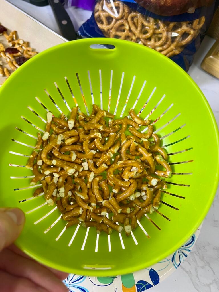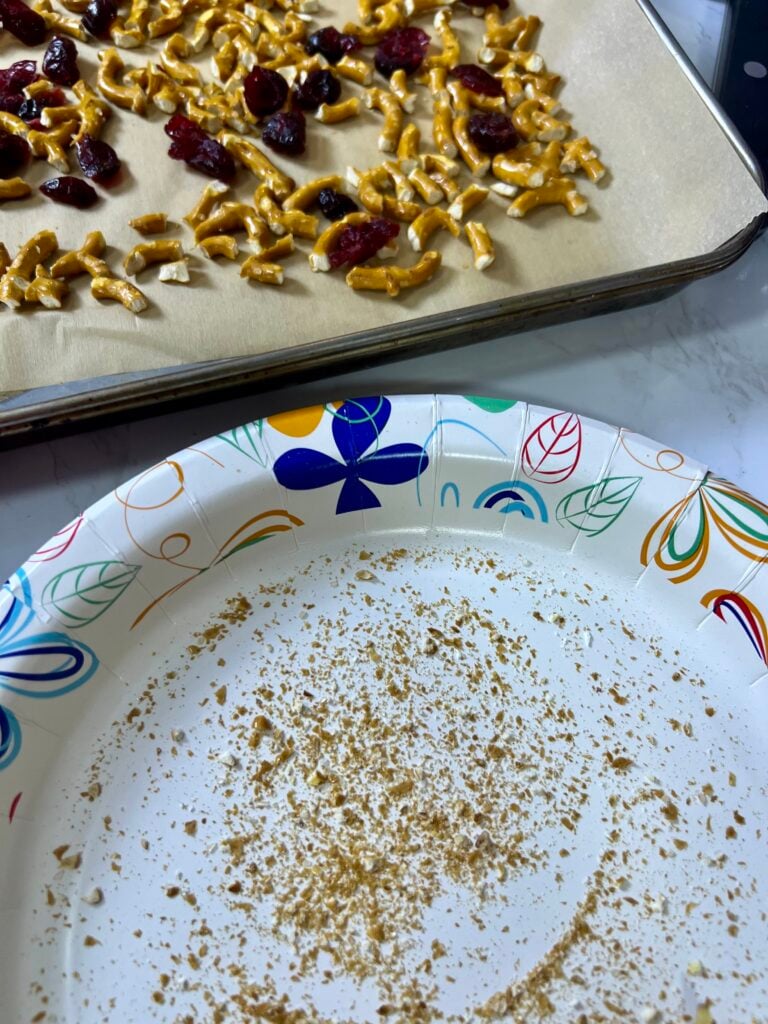 To avoid getting pretzel crumbs on the pan, I like to break the pretzels in a small strainer and shake the crumbs out before adding to the pan.